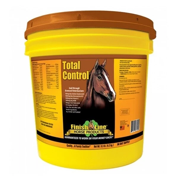 All-in-one Total Control is a combination of Finish Line’s 5 best selling products. These include U-7 Gastric Aid, Iron Power, Apple-A-Day, Fluid Action HA, and Feet First. All of these products combine into one good-tasting daily supplement that helps support 6 systems in your horse: Gastric, Blood Counts, Hydration, Joints, Feet, and Coat.Dosage: 9.3 lb. is 56 day supply for 1 horse at 2 scoops (106cc, 75g) per day.Active Ingredients (per 2 scoops (75g)Glucosamine HCI…..5000mgAloe Vera Concentrate…..130mgPyridoxine Hydrochloride…..42mgSodium Hyaluronate…..100mgSodium Chloride…..14580mgCyanocobalamin…..160mcgAscorbic Acid…..1000mgPotassium Chloride…..9100mgBromelain…..14mgMSM…..2000mgCabbage Powder…..990mgGrapeseed Extract…..32mgOmega 3 Fatty Acids…..3560mgAscorbyl Palmitate…..35mgCalcium Pantothenate…..300mgOmega 6 Fatty Acids…..2410mgIron Sulfate…..1870mgFolic Acid…..20mgYucca…..100mgThiamine Monoitrate…..140mgZinc Gluconate…..8mgNiacinamide…..300mgRiboflavin…..140mgVitamin A…..12350IUTurmeric…..85mgBiotin…..15mgVitamin E…..100IUSlippery Elm…..67mgMethione…..130mg