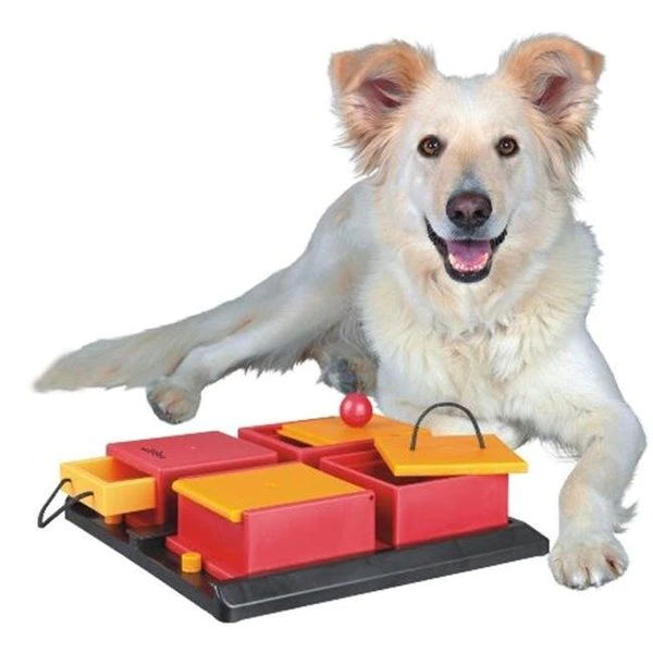 Trixie's poker box is designed for the intermediate canine gamer. Each compartment has a different challenge to master in order to retrieve a treat – lids. flaps. knobs. ropes and drawers Level 2.FeaturesSet includes – 4 boxes can be individually placed on base or used together.Vary number and placement of treats to increase level of difficulty.Non-slip rubber feet keep the box in place as your dog explores.Includes a booklet with tips and tricks for challenging and training dogs through play.Dishwasher safe.Color – Red & Yellow & Black.Material – Plastic. Rubber. Rope.Dimension – 12 x 3.75 x 12 in.Item Weight – 1.94 lbs.
