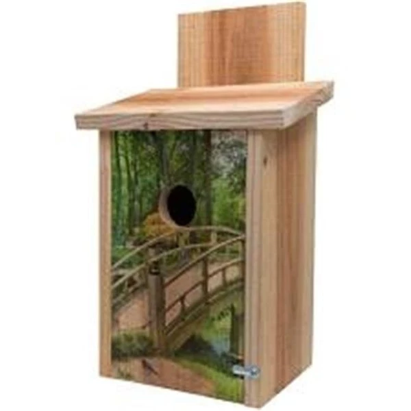 FeaturesLots of room for the family to growYou can mount the house on a T-postor you can mount the blue bird house directly to a wood fence post or a treeThe optional BBV adapter to mount it on a tri-tel or quad-tel poleSpecificationsDesign: Wooden bridgeWeight: 4 lbs