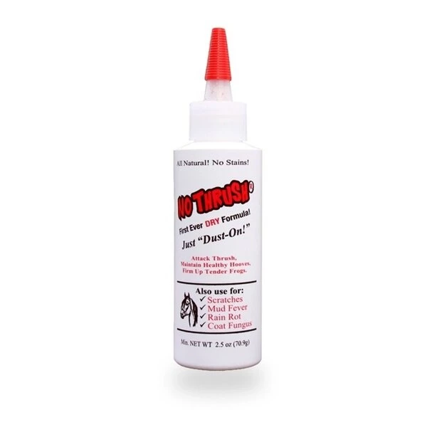 The first ever "DRY" approach to thrush treatment. It is a safe, all natural formula that is "dusted on" with a thin-tipped squeeze bottle, which provides excellent coverage of the infected area. The ingredients have been ground into a fine powder so it finds the damp, deep-in places that wet products can not find. It will not burn your horses tender tissue with chemicals. Full detail at www.nothrushshop.com.