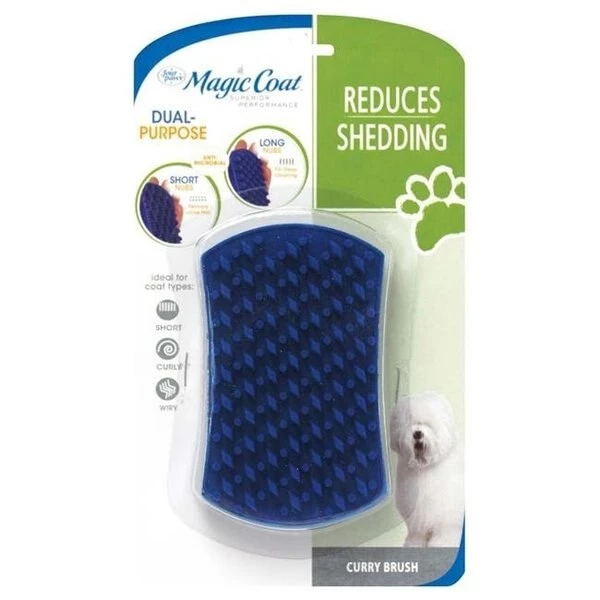 Our Four Paws Magic Coat Silicone Curry Brush with anti-microbial protection prevents bacteria from developing on the brush for a hygienic grooming session. Plus. its double-sided: One side had long nubs for deep cleaning. and the other side has shorter nubs that remove loose hair from your pet. furniture. and clothing. Massaging the coat with the curry brush also strengthens hair and stimulates the natural oils of the skin. Use wet or dry! FeaturesMagic Coat Grooming Brush Anti BacterialSpecificationsWeight: 0.1875 lbs