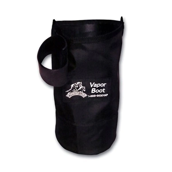 Giddyap Girls VaporBoot is constructed of premium grade ballistic nylon that is extremely durable. This design includes a hi-density non-permeable waterproof interior, a gusseted closure that is secured by a flexible neoprene SnugSeal strap to help support and fasten, and a removable rubber disk that gives structure to the boot and stability to the horse.The VaporBoot is designed to be used with Chlorine Dioxide Gas products which are highly effective in the treatment of White Line Disease, thrush, skin fungus and hoof rot. It is smaller in size than the Original Giddyap Girls SoakingBoot, but fits most hooves. MADE IN USA.