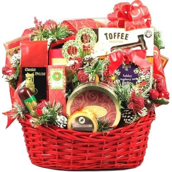 Bigger is better when you're talking about a holiday gift basket overflowing with holiday favorites! This eye-catching beauty will draw crowds as they unwrap and discover all of these delicious goodies tucked inside:Creamy Assorted English Toffee in Gift Box w/ Mini HammerHoliday Raspberry Tea Cookies in a Beautiful Wreath BoxTin of Plump Georgia Pecans Smothered In Milk Chocolate and CaramelCaramel Cheesecake Dessert CookiesCranberry Pecan CookiesRich Belgian Truffles Dusted With CocoaChocolate Drizzled PopcornChocolate Almond Toffee RocaAmaretto Liquor CakeAssorted Classic Godiva TrufflesChocolate Filled Wafer CookiesLarge Assortment of PralinesOld Fashioned Ribbon CandySmoked Gouda CheeseCheddar Cheese Mixed With CranberriesChipotle Cheese SpreadHickory Smoked Beef SalamiHickory Smoked Beef Summer SausageFocaccia Crisps Tuscan Style CrackersPepper and Poppy Water CrackersWild Alaska Smoked SalmonMixed NutsSpicy Szechuan Snack MixToasted PeanutsHoney Mustard Gourmet Pretzel NuggetsOne Pound of Creamy Gourmet Handmade Chocolate FudgeAssorted Holiday Picks and DecorationsLots and Lots of Style