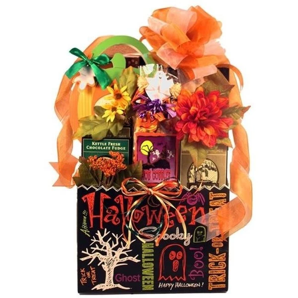 This unique gift arrangement to their door for Halloween is sure to be the best treat of all It features a heavy duty designer gift box with a eye-catching chalkboard Halloween design. which arrives piled high with a delicious selection of sweet treats. This gift is so cool its almost spooky!Hurry and get yours today for Halloween before the disappear!IncludesHob Gobbles Caramel Corn and Nut MixCreamy Chocolate FudgePumpkin Pie CookiesAssorted Hard CandyMore Creamy FudgeCrème Brulee Cookies with White Chocolate Cream Cheese Caramel DrizzleChocolate Ganache Dessert CookiesChocolate Wafer CookiesCookies with Swiss Milk Chocolate and White Chocolate Decorations