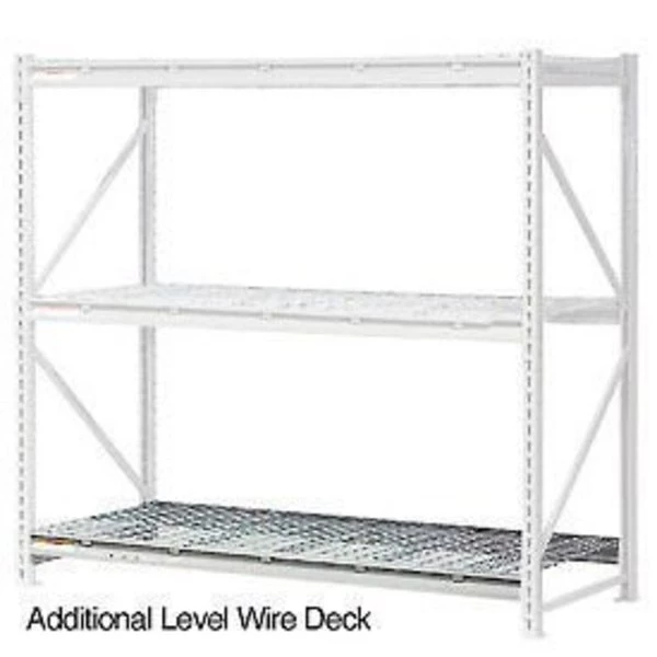 ADD ANOTHER LEVEL TO YOUR BULK RACK FOR MORE STORAGE SPACE. INCLUDES ONE PAIR OF Z-FORM BEAMS, STEEL DECKING AND 6 DECK SUPPORTS. BEAMS ARE MADE WITH 3-1/2"H X 12 GAUGE Z-FORMED STEEL FOR EXTRA STRENGTH. FEATURES THREE LARGE 1" HOOKS ON EACH END FOR POSITIVE CONNECTION TO UPRIGHTS. GALVANIZED STEEL DECKING OFFERS A LONG LASTING, SMOOTH SURFACE WITH A RUST INHIBITING FINISH. DECK SUPPORTS PROVIDE ADDED STRENGTH AND SUPPORT FOR GREATER CAPACITY. EASILY ATTACHES TO BEAMS FOR TOOL-FREE INSTALLATION. GRAY POWDER COAT FINISH.