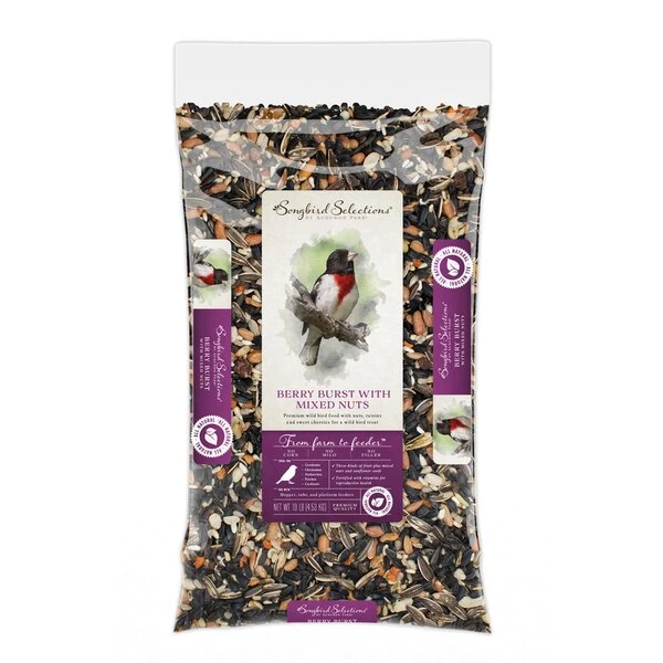Fortified with vitamins for reproductive health. Ideal blend for grosbeaks chickadees nuthatches finches and cardinals. Berry Burst with Mixed Nuts wild bird food is blended with nuts raisins and sweet cherries for a wild bird treat. Contains sunflower peanuts safflower mixed feed nuts raisins dehydrated papaya dehydrate cherries calcium carbonate mineral oil flaxseed oil mixed tocopherols vitamin A & E supplement riboflavin D-calcium pantothenate vitamin B-12 supplement biotin and roughage products. Crude protein 16% crude fat 30.50 % crude fiber 28%.