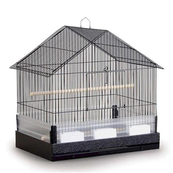 Features: Made in the U.S.A. 22" L x 15" W x 23" H 5/8" Wire Spacing Wire Gauge: 11 & 13 Wrought iron with solid metal base construction with a black powder coated finish Lead and zinc free cages that are non-toxic and bird safe House style design Removable bottom grille and pull out drawer for easy cleaning 3 Plastic feed cups 2 Wood perches Convenient carrying handle Plastic seed guards help contain messes The House Style Cockatiel Cage features a solid metal base and plenty of room for your bird to perch. This bird cage;is designed for cockatiels and other small to medium birds. Features removable grille and pull-out drawer for easy cleaning. Includes 3 plastic outside access feed/water cups. 2 wood perches and a plastic seed guard set.