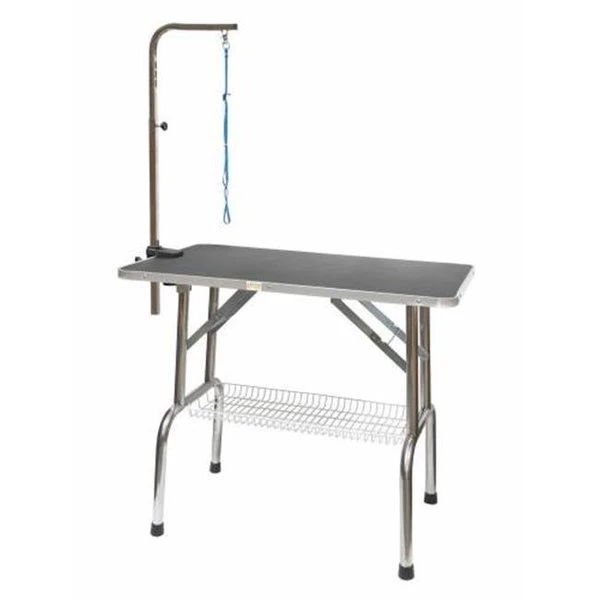 The Go Pet Club Grooming Table is a great investment for any professional or in-home groomers! All of our tables come with a grooming arm and leash loop that is easily attached to our table tops with a clamp. Our table tops have a deluxe aluminum alloy edging paired with a water proof top layer. preventing absorption and warping of the wood underneath. All of our tables come with a pebbled. non-slip surface to keep your pet safe while you work! Our durable and convenient grooming table contains a static free surface. making your table easily cleaned and maintained. This table comes specifically with a storage accessory shelf under the table for added convenience! The Go Pet Club Grooming Tables are perfect for home or professional use.