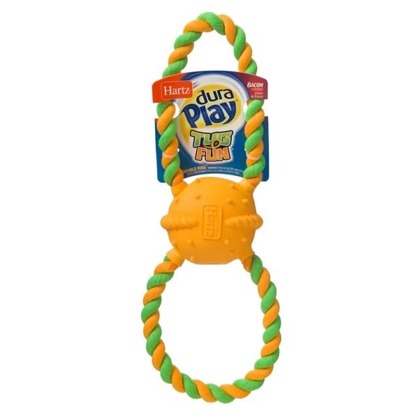 The Hartz Dura Play brand is made even more fun and interactive with the Tug of Fun line extension of toys. The dumbbell’s tough latex shell and foam filling with nubby ridges make for a desirable chew while the sturdy rope running through the toy offers enjoyable hours of tugging and tossing. The dumbbell design allows dogs to easily grasp the toy in their mouths on both ends. Pet parent and pup will enjoy endless hours of tug and fetch action! This toy is bacon-scented too enticing even the most inactive dogs to play on all four paws.