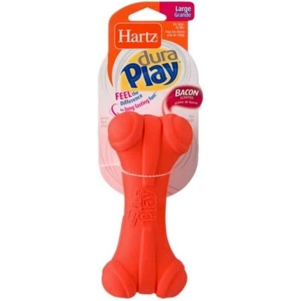 The Hartz Dura Play Dental Dog Bone is a natural latex dog toy that provides long-lasting fun. The exterior is made of firm. natural latex for durability;; interior uses foam technology for a chewier. bouncier toy with an irresistible squeaker creating an unmatched chew experience with an enticing bacon scent dogs go crazy for. Fun to throw and bounce. Dura Play toys even float. Soft. flexible and easy to clean this toy is perfect for dogs of all ages. FeaturesGreat for senior dogs to teething puppiesLightweight to throw. carry and bounceMade from natural latexBacon scentedBacon scentedSpecificationsPet Type: DogLength: 3.5 in.Width: 2.5 in.Height: 9.25 in.Color: Assorted ColorsWeight: 0.2 lbs
