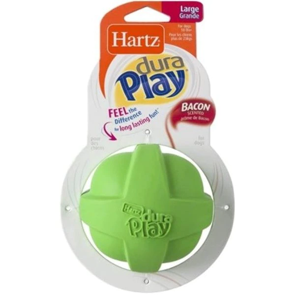 The Hartz Dura Play ball is made of natural latex providing long-lasting fun while utilizing foam technology that enhances durability. This creates an unmatched chew experience with an enticing bacon scent dogs go crazy for. Fun to throw and bounce. Dura Play toys even float and are easy to clean. Soft and flexible to the touch and perfect for dogs of all ages. even senior dogs and teething puppies. FeaturesExterior is made of firm. natural latexFor dogs of all agesBacon scentedIncludes an irresistible squeakerLarge size for dogs 50 lbs and overSpecificationsSize: LargeWeight: 0.22 lbs