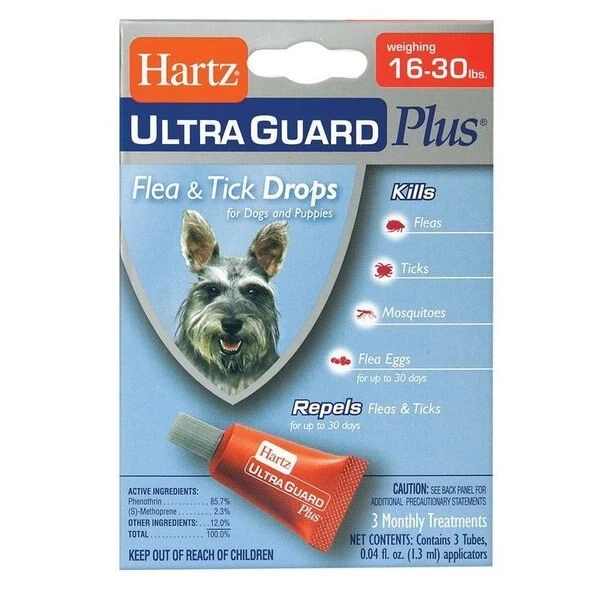 Say goodbye to fleas and tick with Hartz UltraGuard Plus Flea & Tick Drops for Dogs and Puppies. Each convenient and easy to apply single dose tube kills fleas brown dog and deer ticks flea eggs and repels mosquitoes for 30 days. Features the patented Pro-cision Flo applicator system that penetrates pet hair allowing for application of treatment at skin level. Contains both an adulticide to kill adult fleas ticks and mosquitoes and an insect growth regulator (IGR) to kill flea eggs before they hatch.