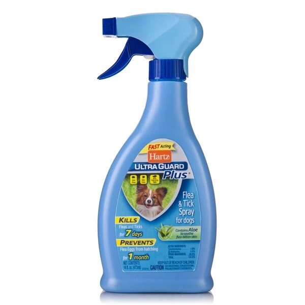 Get through flea and tick season without an itch! Hartz UltraGuard Plus Aloe Flea & Tick Dog Spray kills and repels pesky fleas and ticks for up to 7 days while preventing re-infestation by stopping flea eggs from hatching for 30 days. The convenient spray bottle disperses a wide gentle stream of product enriched with aloe to help soothe your dog's delicate skin.