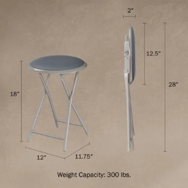Set up extra seating in seconds with the 18-Inch Folding Bar Stool by Hastings Home. This collapsible stool is constructed from 1mm thick steel tubing for strength and durability. The heavy-duty metal frame also gives the stool a 300-pound weight capacity, making it perfect for both children and adults to use. The extra thick, PVC covered cushioning provides a comfortable seat and cleans easily with a soft, damp cloth and soapy water. The spring action lock keeps the stool securely open during use, and the seat can fold flat for convenient storage or easier travel to parties, family gatherings or wherever you need an extra seat!