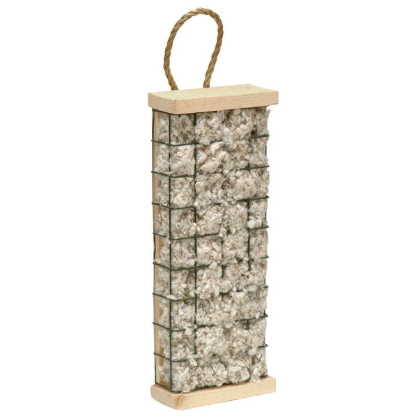 All natural nesting material. Refillable container. Synthetic manila rope hanger resists rot.