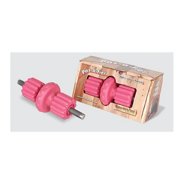 Apple scented, horse pas-a-fier with rotation of 3 elastomer rubber wheels has been proven to reduce boredom related problems such as wood chewing and cribbing. Easy installation.