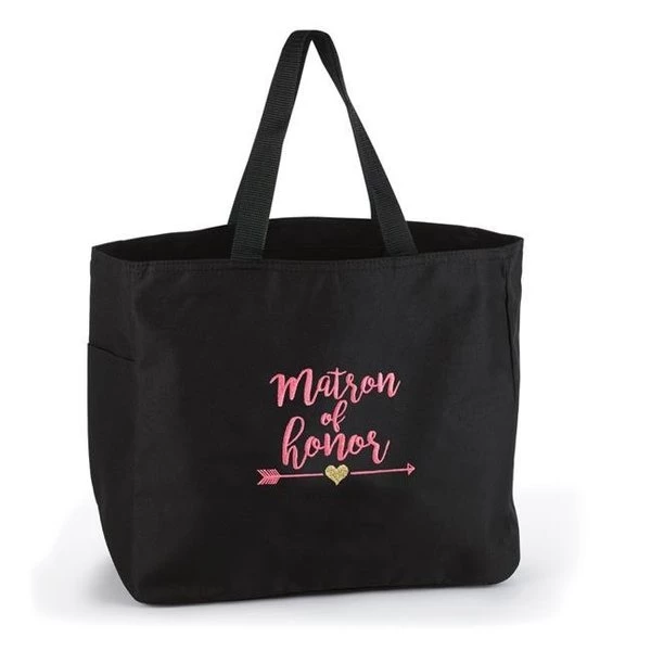 Make your wedding more special and innovative by adding features like wedding reception. attractive gifts. Themes and so on. Wedding memories are most precious;; moreover. if you use those kinds of addons. it would be most ever best. FeaturesBlack 100% polyester tote bag with black handles. inner and outer pockets.Design embroidered in salmon and metallic gold thread.Machine washable.SpecificationsDesign: Matron of HonorWeight: 0.57 lbs