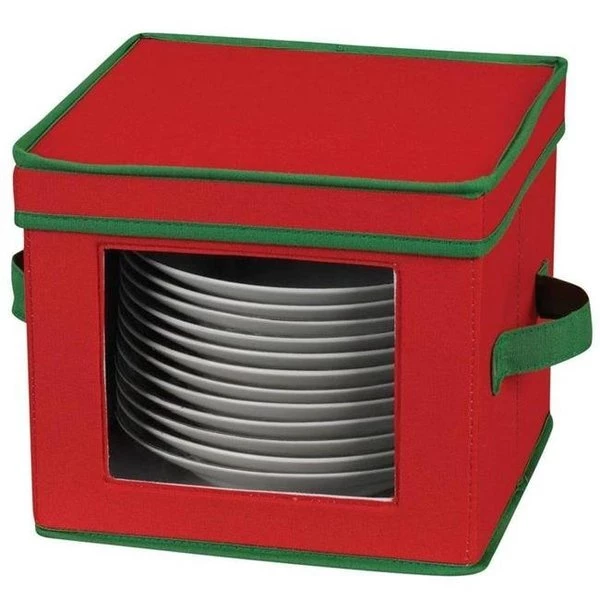 Strong and durable boxes are festively attired in red polyester canvas with green trim just for the holiday season! Windows in the boxfronts allow pieces and patterns to be seen. Each chest comes with felt protectors or cardboard dividers to store a service for 12. Riveted handles support weight up to 25lbs.Height: 8".Width: 10".Depth: 10".Color: Red with Green.