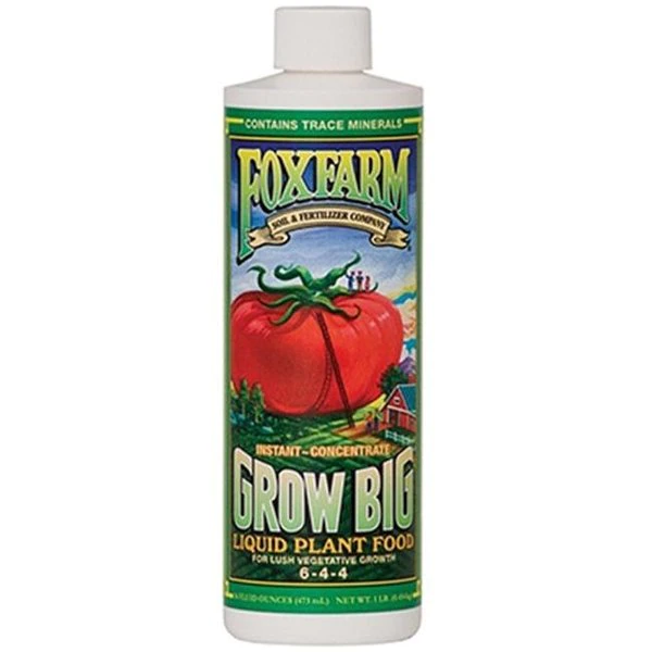 FeaturesPint Foxfarm Grow Big Liquid Plant Food ConcentrateDelivers Extra Strength Grow Power With Micro NutrientsFast Acting. Water Soluble For Lush. Vegetative Compact GrowthUse Early In The Season When Young Plants Need An Extra BoostContains Earthworm Castings & Norwegian Kelp To Encourage Sturdier Healthier Stems & LeavesProvides Enough Nutrients & Trace Minerals To Create The Kind Of Healthy Branching Needed Later In The Season For More Abundant Buds & BloomsAllow New Plantings A Few Days To Settle InBegin Using At The Rate Of 2 Teaspoons Per Gallon Of Water Every Other Time You WaterUse As Foliar FeedingApplying To Both Sides Of Leaves Preferably Early In The MorningAt The First Sign Of Flowering. Switch To Big Bloom Liquid Plant Food.Dimension – 2.5 x 2.5 x 7.81 in.Item Weight – 1.3 lbs.