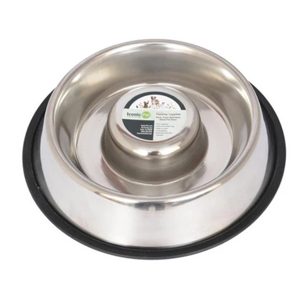 Iconic pet slow feeding bowl made of high quality stainless steel for durability Stainless steel slow feeding pet bowl with raised centre slows down gulping of the food. uniquely designed to improve feeding while reducing choking of your lovable cat or dog Iconic pet slow feed bowls innovative model slows down consumption of food and improves your pets digestion allowing better nutrient absorption Anti skid rubber ring at the bottom provides more stability. reduces the noise so that your pet can enjoy the meal Bowl without rubber ring is dishwasher safe and hand wash the rubber ring separately. SpecificationsColor: LargeSize: LargeCapacity: 48 ozMaterial: Stainless SteelDimension: 2.25" H x 13.5" W x 13.5" LCountry of Origin: IndiaWeight: 1.56 lbs