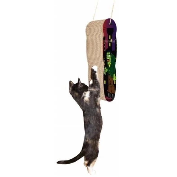Our thrilling Frankenstein Hang 'n Out Scratch 'n Shape is designed to satisfy a cat's vertical scratching needs. Arrives pre-strung for quick and easy hanging from a door knob or other surface. Comprised of 30% minimum recycled materials and 100% recyclable. Includes a bag of Certified Organic Catnip. Made in USA. Depth: 4" Width: 3.25" Height: 14.75"