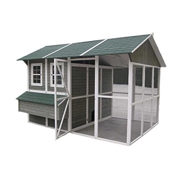 Coops & feathers. extreme walk in walk in barn coop. unique lay out with 2 separated areas & 2 separate entrances. you can enter from the backyard area or directly into the barn from full sized doors. backyard area gives your flock plenty of room to roam around & get some fresh air when the barn is all closed in. with access through a small chicken door at the bottom of the barn. barn area is where you will find the nesting & roosting areas plenty of room for up to 24 chickens. depending on breed. free range door allows the flock to roam free as they wish & is closeable when it is time for the flock to get back in the barn. inside are 2 full sized windows for ventilation. outside assembled dimensions: 140.6" X 108.3" X 96" FeaturesExterior nesting bays allow easy access to eggsFree range doorSpecificationsDimension: 140.6" x 108.3" x 96"Weight: 545 lbs