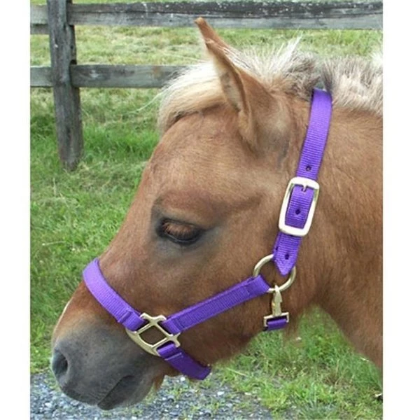 Mini horse nylon halter this miniature horse nylon halter features a double buckle crown for easy fitting. The nylon webbing is 0.75 Wide. This is a top quality halter that is made to last. SpecificationsColor: PurpleMaterial: NylonSize: Mini