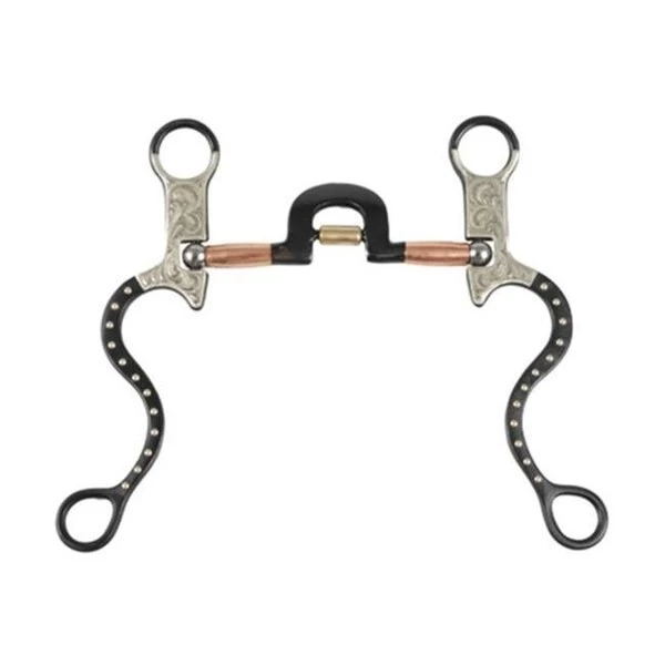 For over 40 years has been dedicated to providing the highest quality products at the lowest prices. We strive to be the most reliable supplier in the equine and pet supply industry.FeaturesWestern Show Snaffle BitBlack steel Show Snaffle Bit with German Silver trimHigh port black steel and copper 5" mouth with brass roller and 8-1/2" cheeks with brass dot design