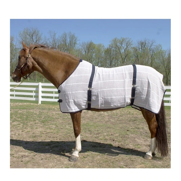 Anti-Sweat Sheet made from 100% cotton material with reinforced double front closures, two outside straight surcingles, standard neck cut and fleece padding at the withers. Machine washable. Possible shrinkage from washing may occur. Natural with navy trim only. For other color choices, please see Item #647IMPORT.WASHING INSTRUCTIONS: Machine wash on gentle cycle with cold water using cold water detergent. Line Dry. Do not machine dry. Do not dry clean.