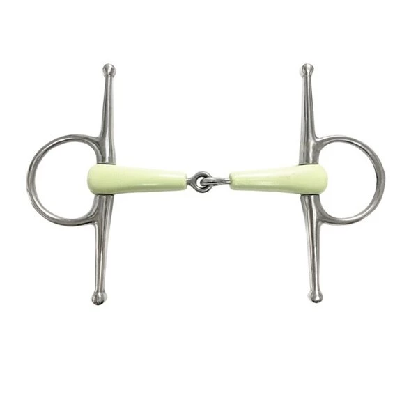 Stainless steel bit with full cheeks and rings and a jointed apple flavored mouth.