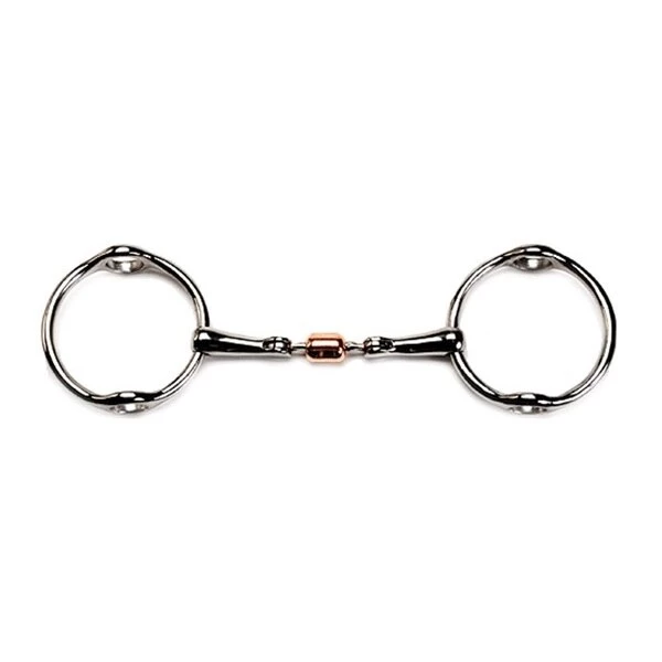 Stainless steel Gag bit with rings with holes and a 5" double jointed mouth with copper roller.