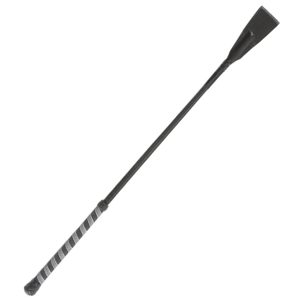 English style Bat with non slip two-tone rubber grip handle, nylon wrapped fiberglass shaft and leather flap. Available in black only.