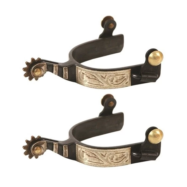 Black steel roping spurs with engraved German silver trim, 3/4" band, 1-3/4" shank, 7/8" 10 point rowel and brass buttons.
