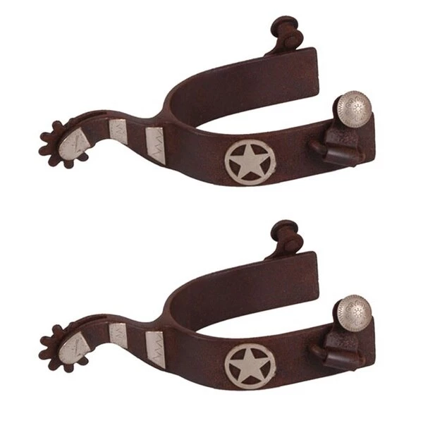 German silver engraved Texas Ranger Star trim, 1" band, 2" shank and 1" 9 point brown steel rowel with silver engraved swing buttons.