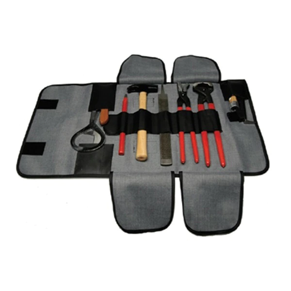 An all in one handy farrier bag that comes already loaded with all the necessary farrier tools conveniently stored in the easy access pockets. Rolls up for easy storage so you will always be prepared for any hoof care issue. Includes hook and loop fastener binding for a secure closure.One of each tool included:# 10241 – Horseshoe hammer# 10239 – 14" forged nail clincher # 10242 – 14" forged hoof nipper# 10260-12 – Rasp with 12" tang# 10279 – Rasp handle# 244534 – Hoof Knife# 10389 – Hoof Tester# 1513 – Clinch Cutter# 24585-BK – Hoof Pick with brush# 387 – PritchelThese items can be found on page 176-177 of the Jacks catalog.