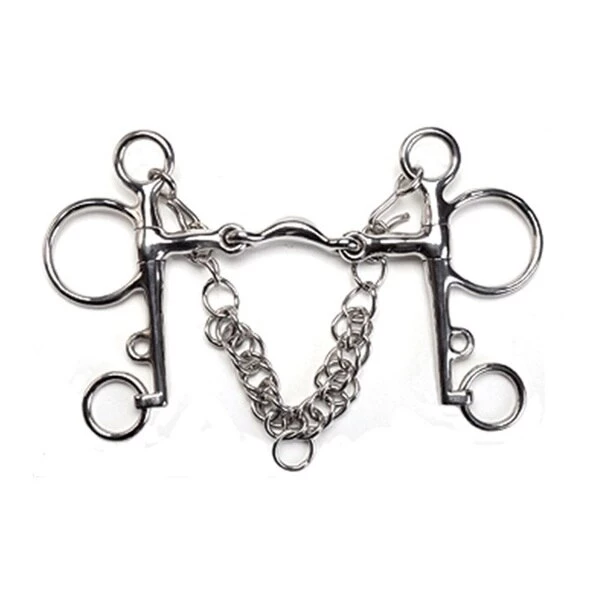Stainless steel Pelham Bit has a 5" double jointed quarter moon mouth with thickness of 12mm and 5-1/2" cheeks.