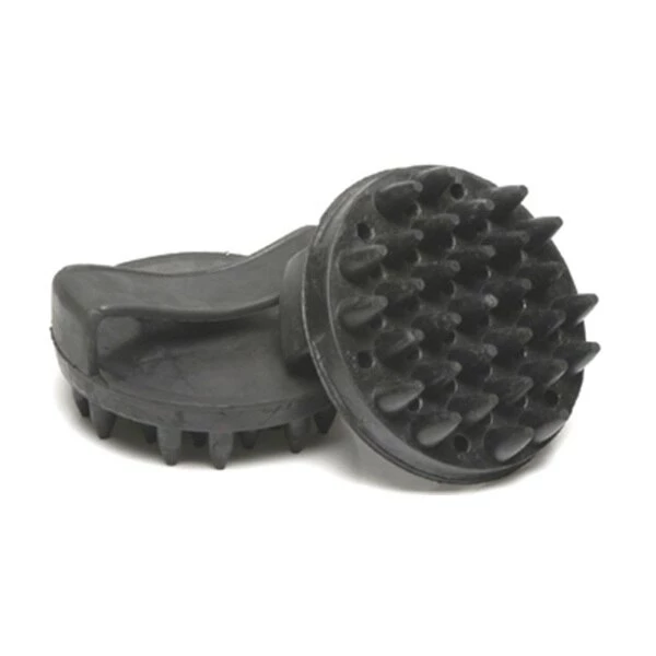 Uniquely designed Rubber Groomer is made to deep clean and massage your horses coat at the same time. Thirty one strategically placed cleaning/massaging fingers will not allow dirt or hair to build up. Features a molded strap back to help make body grooming easier. For best results use in a circular motion. Available in black only. Measures 4 1/2" diameter.