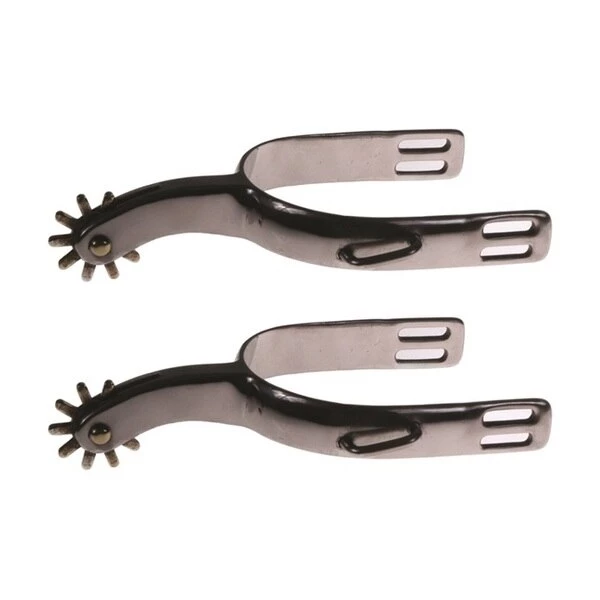 Stainless Steel English Polo spurs with tie down loops, 3/4" band, 2" offset shank, and a 1" 9 point rowel.