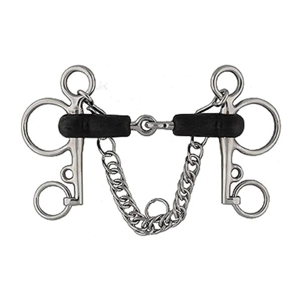 Stainless steel Rubber Mouth Pelham Bit has jointed rubber mouth with mouth thickness of 21mm and stainless steel curb chain.Available in sizes:4-1/2" mouth features 5" cheeks, 2-1/4" arm and 2" rings5" mouth features 5-1/2" cheeks, 2-3/4" arm and 2-1/4" rings5-1/4" mouth features 6" cheeks, 3" arm and 2-3/8" rings