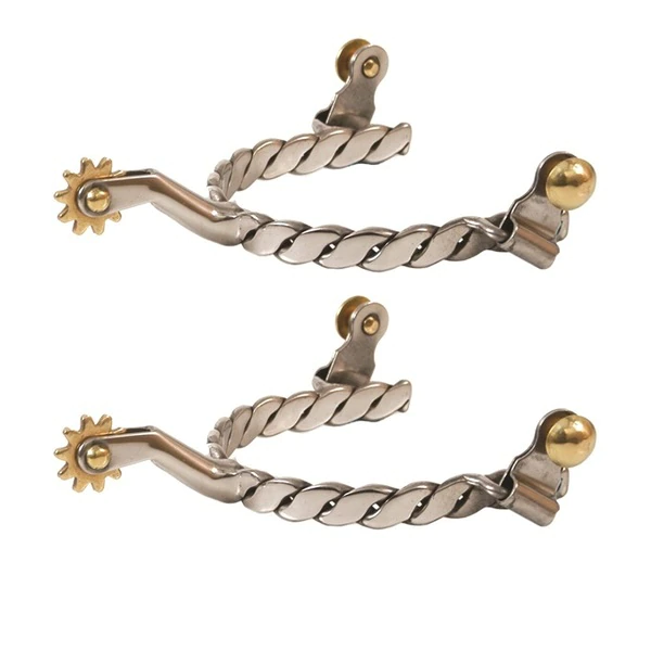 Twisted band stainless steel spurs with 1/2" band, 2" shank, 7/8" 10 point brass rowel and brass buttons.