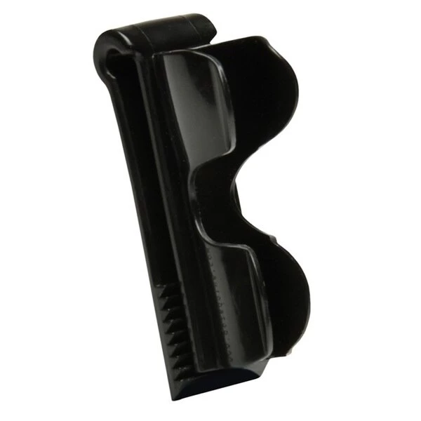 Compact, discreet, two-chambered clip that slides into place over the top of the riders boot or half-chaps. When the crop, whip or bat is not needed, the rider inserts it into the clip safely, securely and near at hand. Available in black.