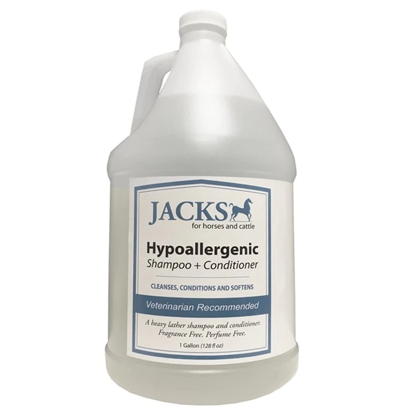 Jacks unique hypoallergenic, deep-cleaning shampoo and conditioner is formulated for every day use. Powerful cleansing action and billowing lather quickly removes dirt and stains while the mild conditioner softens hair and reduces static electricity. Rinses easily and smells great. Veterinarian recommended for equine and show cattle.