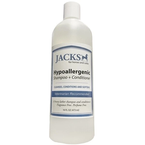 Jacks unique hypoallergenic, deep-cleaning shampoo and conditioner is formulated for every day use. Powerful cleansing action and billowing lather quickly removes dirt and stains while the mild conditioner softens hair and reduces static electricity. Rinses easily and smells great. Veterinarian recommended for equine and show cattle.