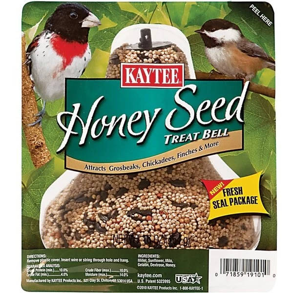 Kaytee Honey Seed Treat Bell is a special honey seed blend with sunflower & millet. Attracts grosbeaks chickadees finches & more. Less mess than loose seed. Ready to hang instant feeder with an air-tight seal for freshness.