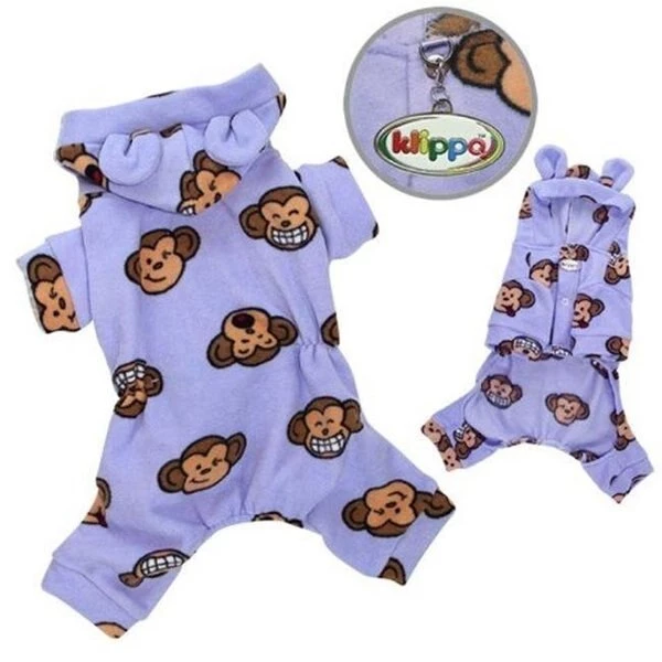 FeaturesSuper cute "Silly Monkey" face expressions all over this High quality & ultra soft fleece dog pajamas.Accented with a pair of adorable monkey ears attached to the hood.With short elastics on each side to provide a better fit around the body. snap button closure.A small D-ring attached above the first snap button to add on charms or ID tag!Each outfit comes in its own Klippo logo charm.Color – LavenderSize – Extra SmallNeck Size – 6-7.5 in.Chest Size – 10-12 in.Back Length – 6-8 in.