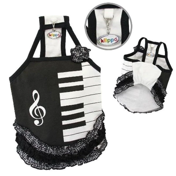 FeaturesStretchable cotton piano dress with an imprinted large clef note and keyboard.Accented with three rows of tight ruffles and a matching flower on one shoulder strap.A small D-Ring attached near the neck area to add on a charms or ID tag!Each outfit comes in its own Klippo logo charm.Size – SmallNeck Size – 7.5-9 in.Chest Size – 12-14 in.Back Length – 8-10 in.