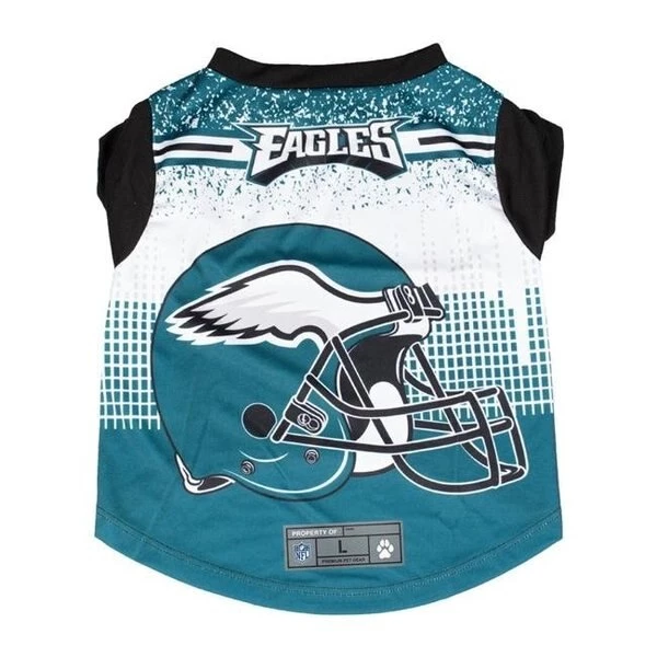 Dress them up in the colorful Dog Performance Tee. and let them represent your favorite team. Made of soft stretch polyester fabric. this tee is easy to pull on or off your dog. Decorated with a full color helmet graphic on the back. and team wordmark on the front. your pup will get plenty of compliments in their new team shirt.FeaturesStretch polyester knitContrast collar and sleevesMoisture wickingWoven jock tagLeague – NFLTeam – Philadelphia EaglesSize – Medium