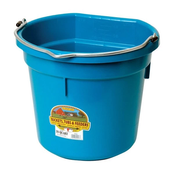 Little Giant Flat-Back buckets are a favorite on farms and ranches everywhere. The Flat-Back fits more compactly for hanging against a wall or fence plus it makes hauling heavy loads a lot easier. Our buckets are made from polyethylene resin that is Impact resistant protects against warpage and helps prevent stress cracks. This bucket features a heavy-duty wire bail with notch for hanging and stacking ribs so the pails come part easier when stacked. 14.75 inch diameter by 13 inch high holds 20 quarts (5 gallons).