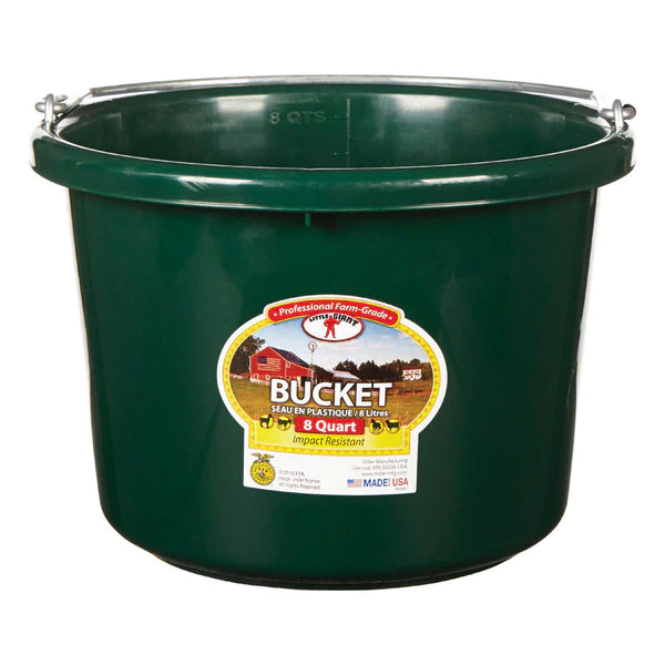 Practical and affordable little Giant plastic buckets are favorites on farms ranches and worksites everywhere. Our buckets are made from polyethylene resin that is impact resistant protects against warpage and helps prevent stress cracks. This handy little round bucket features a heavy-duty wire bail. 11.5 inch diameter by 8.5 inch high holds 8 quarts (2 gallons).