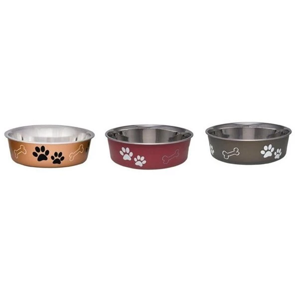 FeaturesSmall Dog Bella BowlStainless steel interiorPoly resin exterior with paw print designRemovable rubber base prevents spills and reduces noiseDishwasher safeAssorted styles